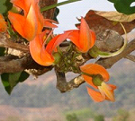 it is a medium sized deciduous tree which grows in open country. During summer (which is also spring time in India) this tree produces clusters of blood-red flowers in great profusion. Bereft of leaves at that time, Palash’s fiery orange flowers dazzle the forest scene, and hence the name Flame of the Forest. In Ayurveda, its bark, flower and resin are used.