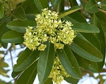 It is a medium sized graceful evergreen tree with dense foliage, and low spreading, drooping branches. It is a sacred tree, commonly found cultivated for its medicinal value. Its wood is shining, fairly hard and close grained. It is used for turning, making tools and for structural works. Leaves and seeds are used in making medicine for curing cold and cough. Leaves of this tree are a good fodder, and its seeds yield oil which is sometime used for burning. Seeds are strung in necklaces and rosaries.